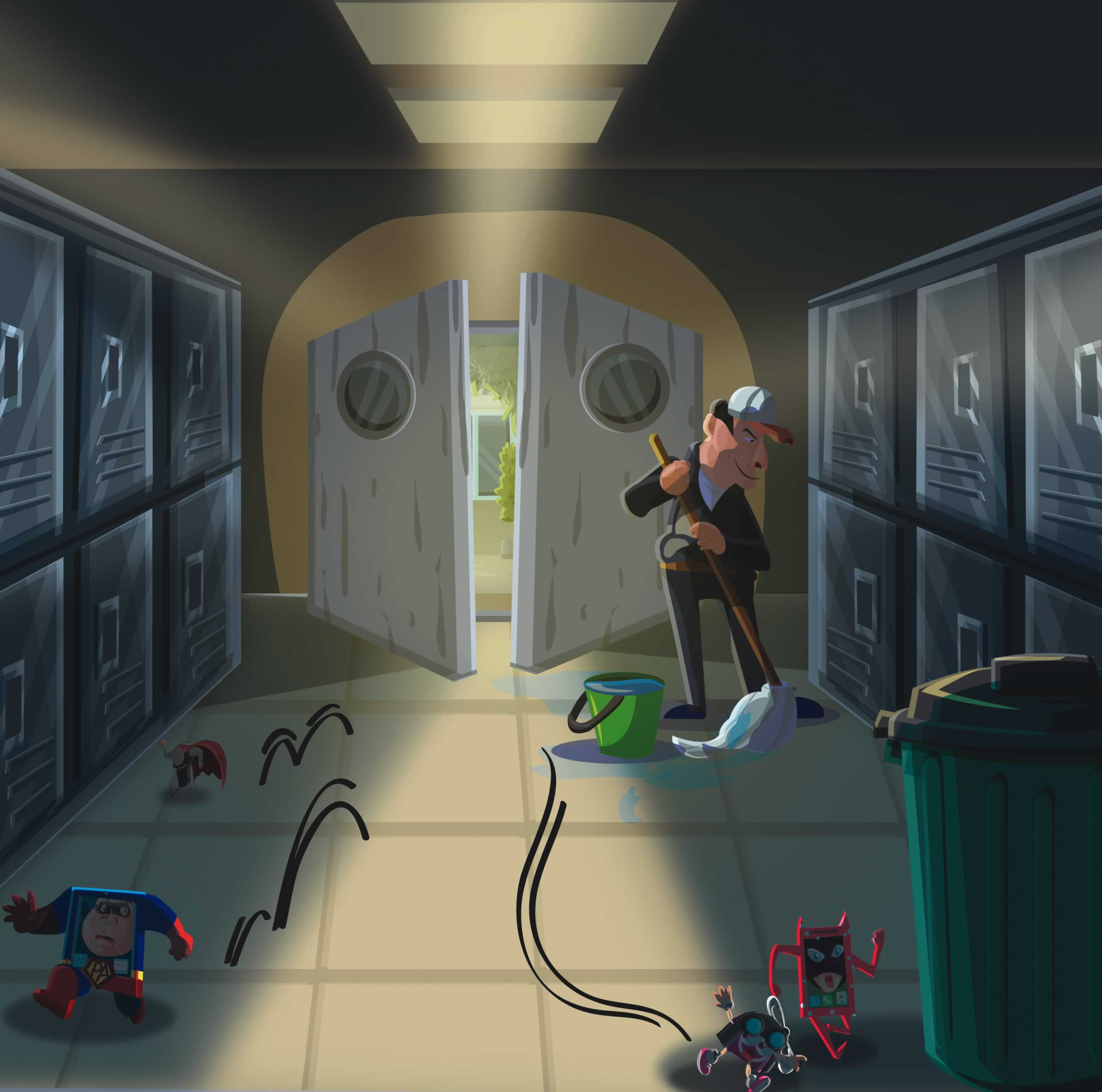Very quietly, the Heroes scurry into the side corridor by the lockers, darting past the caretaker.