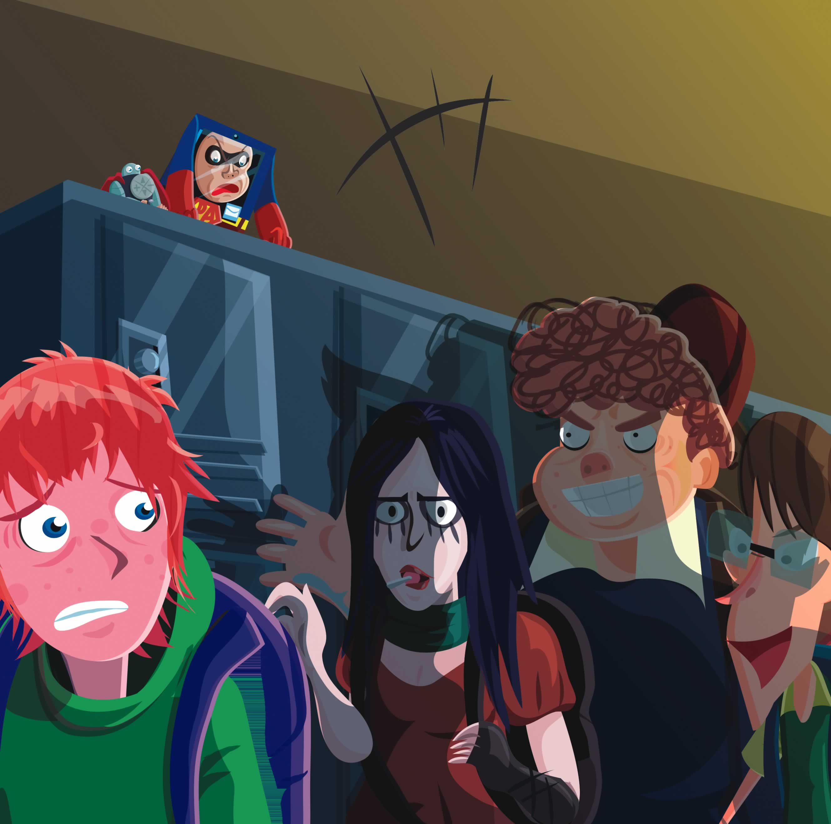 “Celly, Mini,” whispers Remotely, “hide behind that rubbish bin, but make sure you have a clear view of the entrance.” “Paddy, you and I will climb onto the lockers so we can video from the top.”